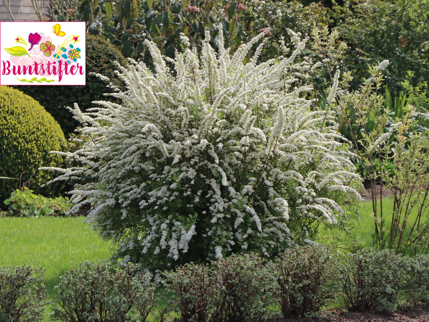 Die Weiße Rispenspiere Buntstifter 'Grefsheim' mit ihren kleinen, weißen Blüten ist eine ideale Bienenweide und ein großartiger Blickfang während der Blüte im Frühling. Auch als Aschgrauer Spierstrauch bekannt, fallen bei (bot.) Spiraea cinerea Buntstifter 'Grefsheim' die Blätter besonders auf. Sie schimmern an der Oberseite in einem stumpfen Grüngrau. Diese Sorte gilt als verbesserte Züchtung der Brautspiere. Die Weiße Rispenspiere Buntstifter 'Grefsheim' blüht am vollsten, wenn sie einen sonnigen Standort mit humusreichem Boden hat. Ansonsten stellt sie keine hohen Ansprüche und wächst auf fast allen Gartenböden gut.