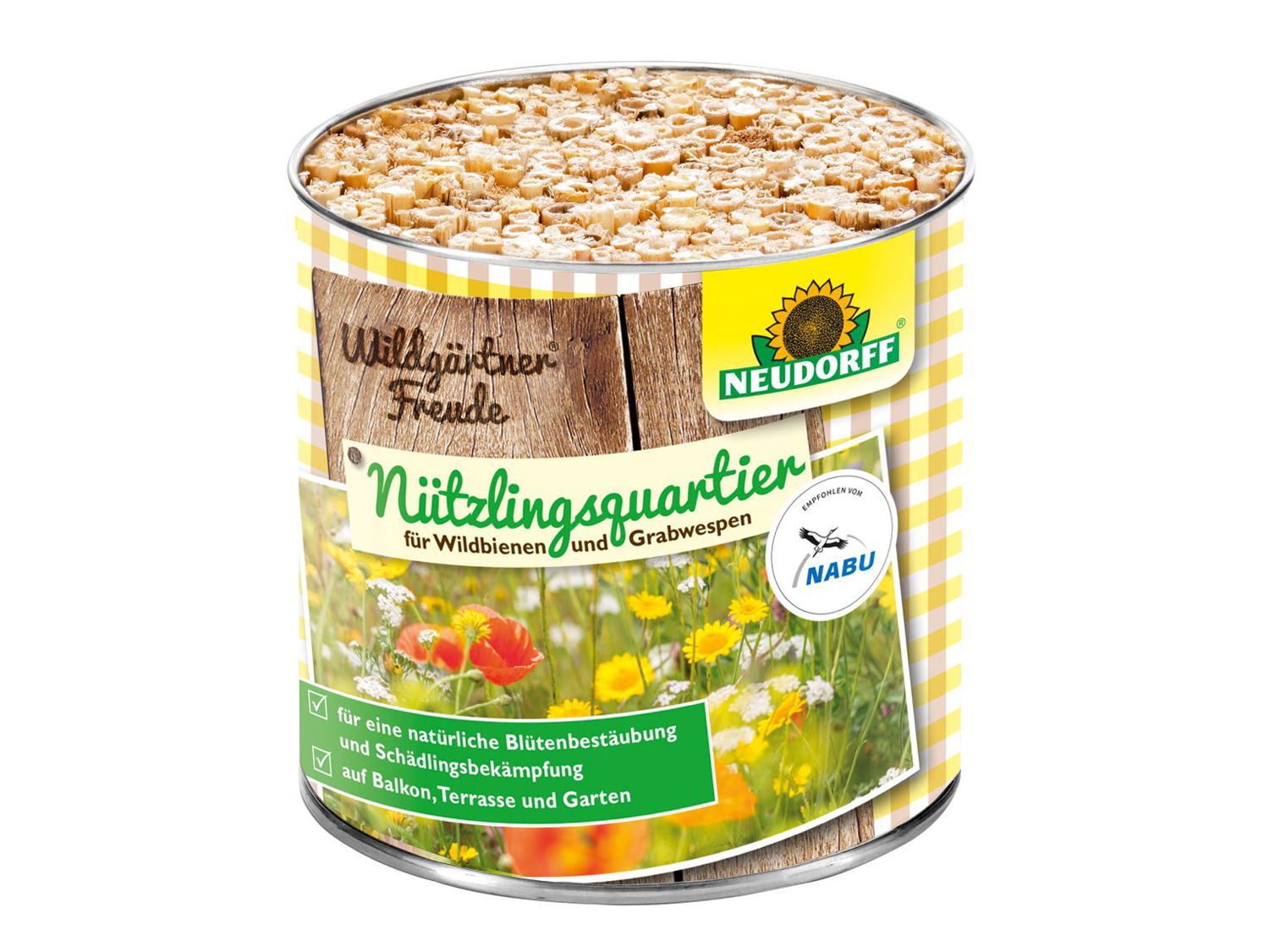 Das Wildgärtner ® Freude Nützlingsquartier für Wildbienen und Grabwespen ist die unkomplizierte Einsteigervariante für den Insektenschutz. Die praktische Dose findet überall einen Platz und lässt sich kinderleicht aufhängen. Für alle, die Wildbienen auch auf dem Balkon einen Unterschlupf bieten wollen, ist die Nisthilfe von NEUDORFF ® ideal! Auch der niedrige Preis macht den Einstieg in das naturnahe Gärtnern interessant. Gefüllt ist das Wildgärtner ® Freude Nützlingsquartier für Wildbienen und Grabwespen mit Reet. Dieses Füllmaterial ist speziell auf die beiden Arten abgestimmt und so nehmen sie die Hilfe gerne an.