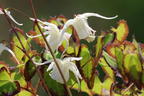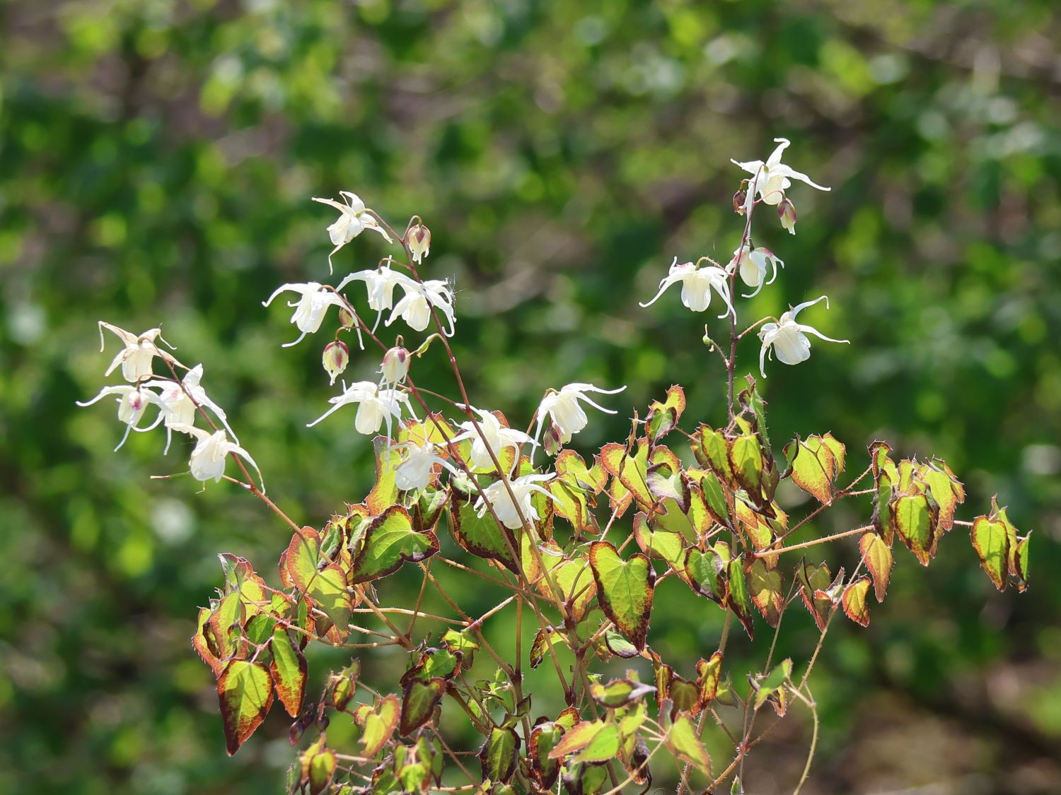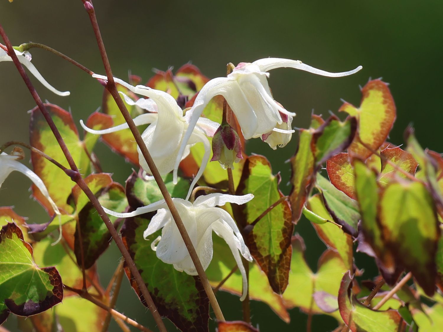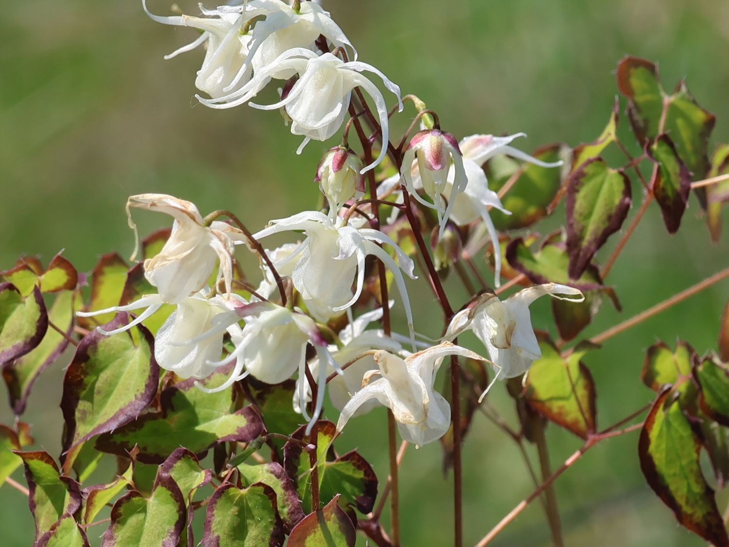 Die Zwerg-Elfenblume 'Bandit' ist ein gelungenes Beispiel dafür, dass Schönheit keiner physischen Größe bedarf, sondern mit beeindruckenden Blüten das zeitige Frühjahr kontrastreich unterstreichen, durch attraktive bodendeckende Gestaltung Lebendigkeit einziehen und für viele Jahre ein optisches Highlight setzen kann. Diese zauberhafte, ursprünglich aus Asien stammende Traumstaude im Zwergformat löst ab April ein wahres Blütenfeuerwerk aus, das sich bis in den Mai zieht. Es sind zarte, weiße Blüten, die unzählige Insekten anlocken. Gerade in der noch frühen Jahreszeit sind Pflanzen wie diese enorm bedeutungsvoll für die Natur und den Artenerhalt. Die Blüten ordnen sich traubenförmig in rispenähnlicher Weise an. Aus ihnen treten lange Spornen empor, die die Gesamtoptik beleben und aus der Ferne leicht mystisch erscheinen. Es ist ein spektakulärer Anblick, den die matten, mittelgrünen Blätter in Herzform charmant ergänzen. Sie wachsen grundständig und ergeben zusammen mit den Blüten eine Höhe bis 15 cm und eine Breite bis etwa 20 cm. In ihrer Textur sind sie ledrig. Neue Blätter begleiten braune bis dunkelröte Linienzeichnungen an den Rändern. Diese verblassen mit der Zeit und der Fokus verlegt sich vermehrt auf die zarten Randzacken. Die Epimedium grandiflorum var. higoense 'Bandit' gehört zu den sommergrünen Stauden. Die Blätter bleiben bis in den Herbst bestehen, bis sie dann abfallen, beziehungsweise sich zurückziehen. Im nächsten zeitigen Frühjahr treibt sie erneut aus und bildet ein kissenartiges Gebilde, das zuverlässig den Boden bedeckt und an den aufrecht wachsenden Stängeln jedes Jahr massenhaft Knospen ansetzt. Sie fühlt sich allein ebenso wohl wie in der Gruppe unter Gleichgesinnten oder anderen Pflanzenarten mit ähnlichen Ansprüchen. Im Kübel lassen sich frühlingshafte Blickfänger auf Terrassen und Balkone zaubern. Besonders gut harmoniert die Zwerg-Elfenblume 'Bandit' beispielsweise gleichartigen Großblütige Elfenblume 'White Queen' oder der Herzblattschale (Jeffersonia diphylla) und dem anschließend blühenden Tibet Scheinmohn (Meconopsis betonicifolia).