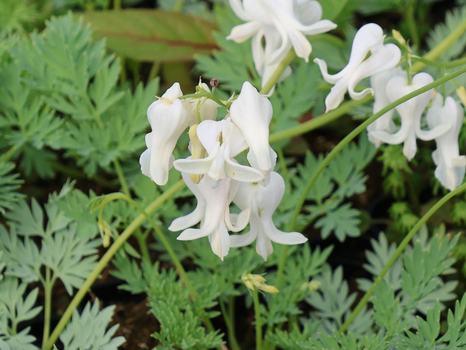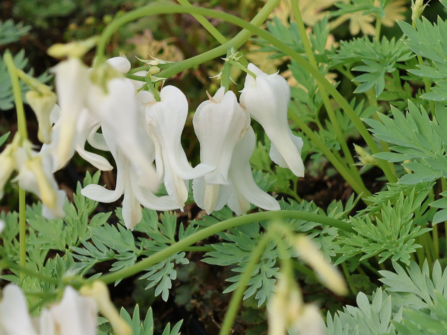 Die Blätter der Pflanzen bringen einen weiteren positiven Effekt in das optische Erscheinungsbild der Pflanze, da sie eine zusätzliche Farbe integrieren. Das intensive Grün der Blätter sorgt dabei zu einem für einen auffälligen farblichen Kontrast gegenüber den weißen Blüten. Zum anderen gewährleistet diese Farbkonstellation aber auch ein harmonisches Miteinander. Die Blätter selbst sind fiederteilig gestaltet. Das verschafft ihnen eine famose farnartige Optik und eine grundsätzlich filigrane Erscheinung. Trotz dieser eher subtilen Ausstrahlung sind die Blätter zudem sehr robust. Die Zwergige Herzblume 'Amore Titanium' bieten Gartenbesitzern zudem einen weiteren Positivfaktor. Denn nach der Blüte zieht sich die 'Amore Titanium' Abhängig standortabhängig häufig in den Boden zurück, um dann im Herbst oder manchmal auch erst im nächsten Frühjahr wieder auf der Bildfläche zu erscheinen. Das kommt einem hervorragenden Winterschutz gleich. Zieht sich die Pflanze zurück, ist es empfehlenswert, die verblühten Teile abzuschneiden. Das schafft Platz für neues Wachstum. Wer die Dicentra formosa 'Amore Titanium' ganz neu einpflanzen möchte, wählt bestenfalls das Frühjahr. Denn diese Pflanzzeit gibt der Zwergigen Herzblume genügend Zeit, um bis zum kommenden Winter zuverlässig einwurzeln zu können. Wichtig ist außerdem, dass direkt bei der Pflanzung ein wenig Kompost beigemischt wird. Das ermöglicht den Pflanzen mit ihren zarten Blüten einen guten Start. Herzblumen dieser Art gelten als klassische Bauerngarten-Pflanzen, kommen aber auch oftmals als haltbare Schnittblumen zum Einsatz. Wird die Zwergige Herzblume 'Amore Titanium' für die Bepflanzung von Beeten genutzt, stellen zum Beispiel späte Zwiebelblumen Akeleien, Funkien (Hosta), Purpurglöckchen (Heuchera) und andere Blattschmuckstauden oder auch Salomonssiegel (Polygonatum) und Kaukasusvergissmeinnicht (Brunnera) sehr gute Beetpartner dar.