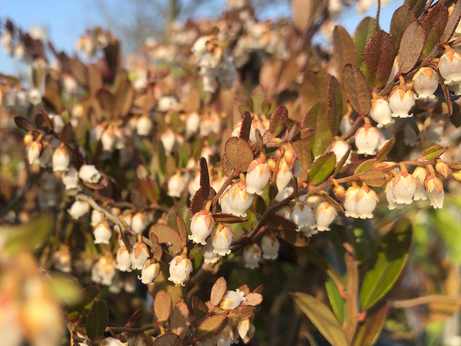 Von April bis Mai präsentiert sich der niedrige Zierstrauch von seiner schönsten Seite. Nun zeigt er seine niedlichen weißen Blüten. Sie erinnern an Glöckchen und hängen nickend an den Enden der Triebe. Sie stehen in Trauben zusammen und machen in strahlendem Weiß auf sich aufmerksam. Die Kronblätter sind krugförmig verwachsen und zeigen fünf adrette Saumzipfel. Ein schönes Detail sind die Kelchblätter, die braun beschuppt einen hübschen Kontrast zu den weißen Kronblättern bieten. Aus den Blütenblättern blitzen zarte Staubfäden hervor. Insekten besuchen die Blüten und Bienen zeigen sich häufiger zur Blütezeit an diesem Gewächs. Der Zwerglorbeer / Torfgränke 'Nana' bevorzugt sonnige Plätze im Garten. Besonders wichtig ist ein ausreichend feuchter Boden. Da sich diese Umstände im Garten häufiger ausschließen, achtet der Gärtner darauf, regelmäßig zu gießen. Idealerweise steht die Pflanze in moorigen bis nasstorfigen Böden, die sauer und nährstoffarm sind. Auf ein Düngen verzichtet der Pflanzenfreund. Aufgrund der natürlichen Herkunft rings um den Polarkreis, ist Chamaedaphne calyculata 'Nana' extrem winterhart und toleriert frostige Temperaturen von bis zu rund -40 Grad Celsius.